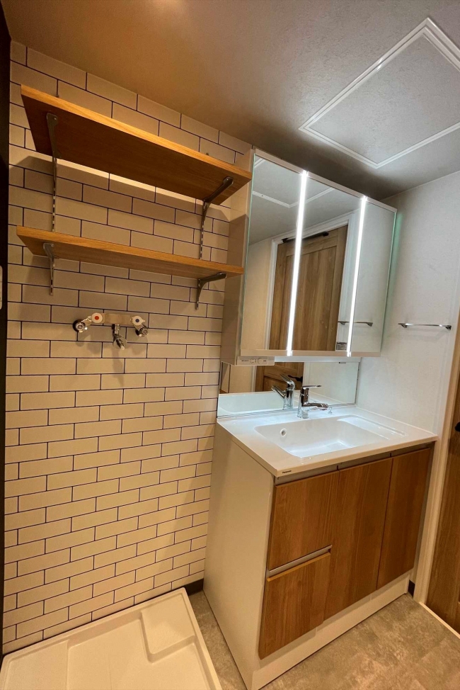 | リフォーム内容 | ・洗面化粧台交換 ・天井壁クロス貼り替え ・床フロアタイル貼り ・可動棚新設 ・洗濯機パン交換 |